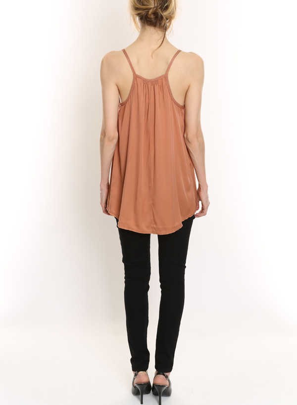 Silk cami. Tie front detail, with hook and eye. Ruched neckline. Loose through the chest and bodice. 100% Silk. Dry clean.